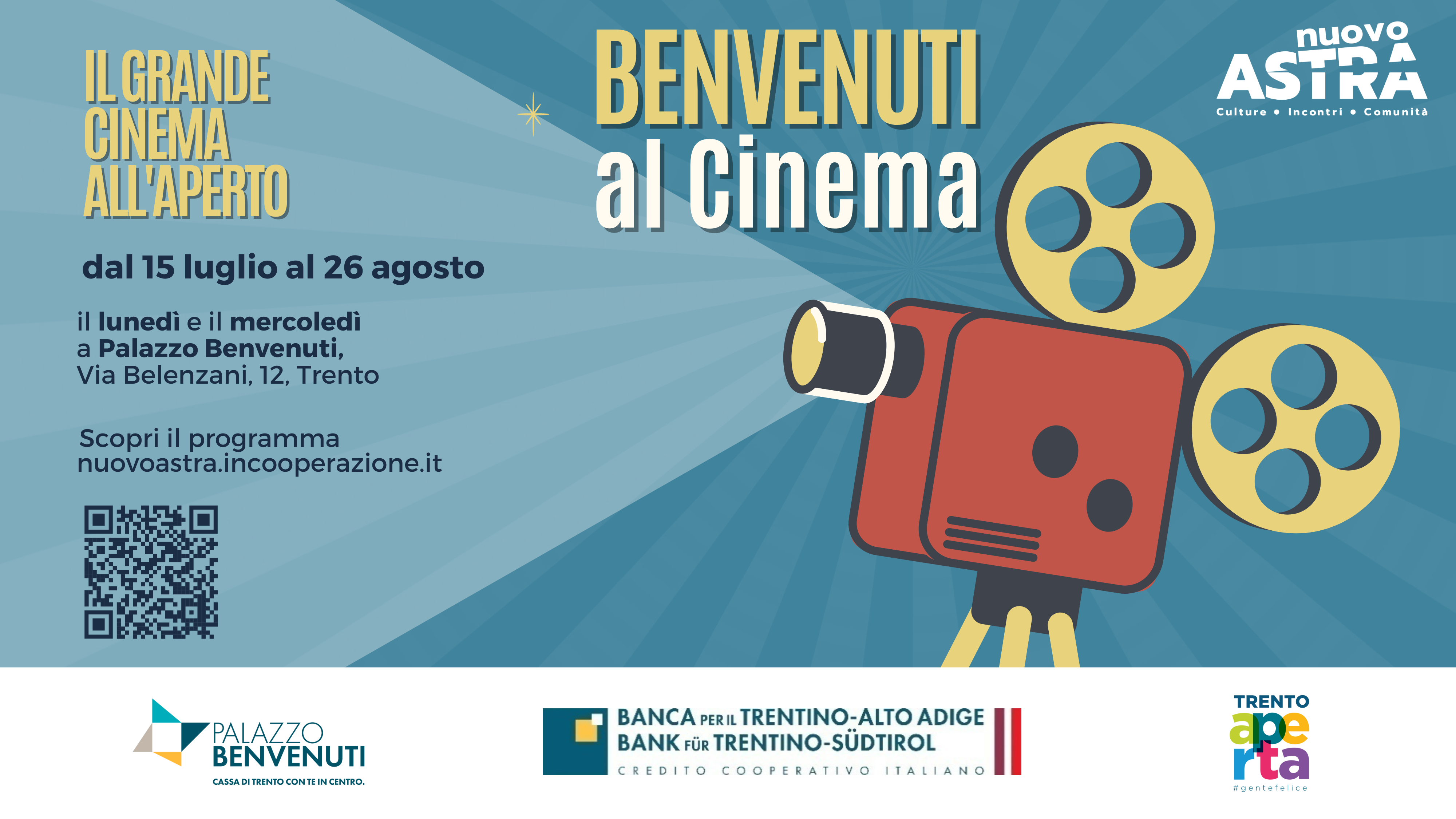 Dal 15 luglio al 26 agosto a Palazzo Benvenuti, nel cuore di Trento, torna il cinema all'aperto in collaborazione con il Cinema Nuovo Astra.